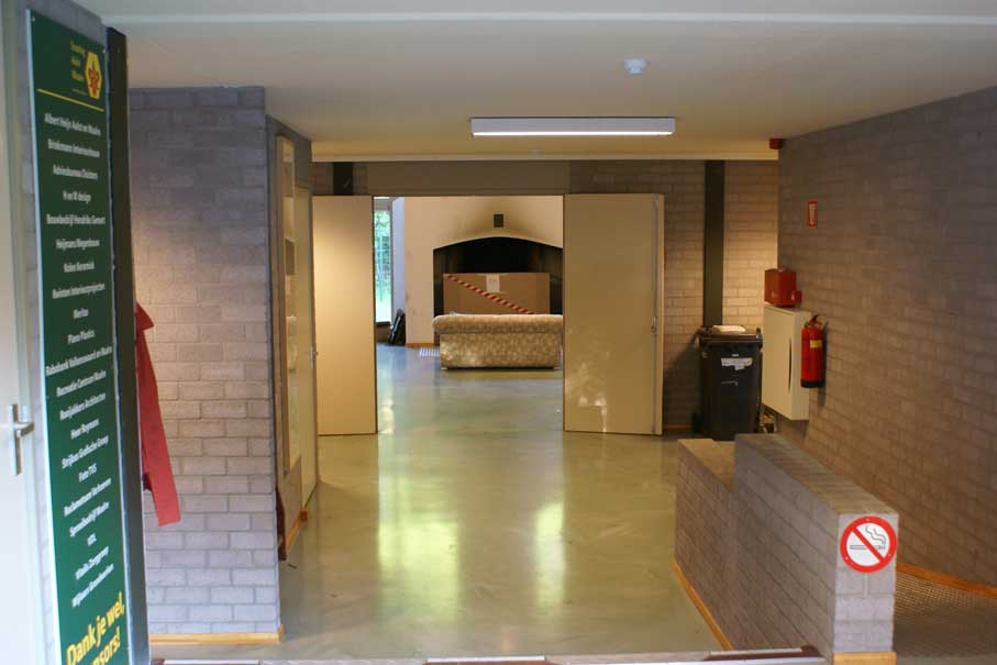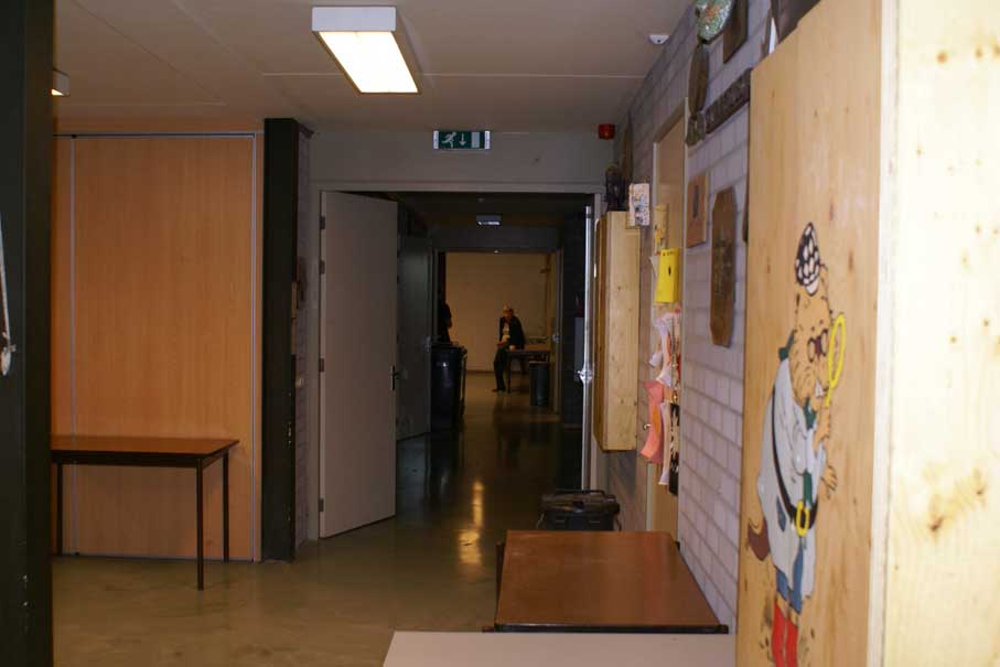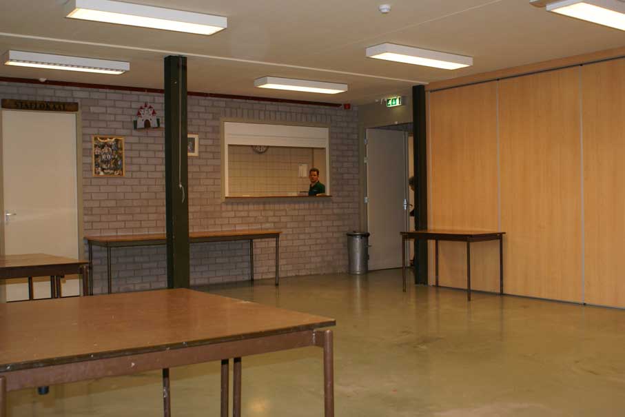 Aan het linker lokaal (65m2) grenst een staf lokaal (12m2) en aan het rechter lokaal (65m2) grenst de keuken. Alle deze ruimtes (behalve het staf lokaal) zijn direct van uit buiten toegankelijk en grenzen binnen direct aan de centrale hal (zie foto 6 en 9).