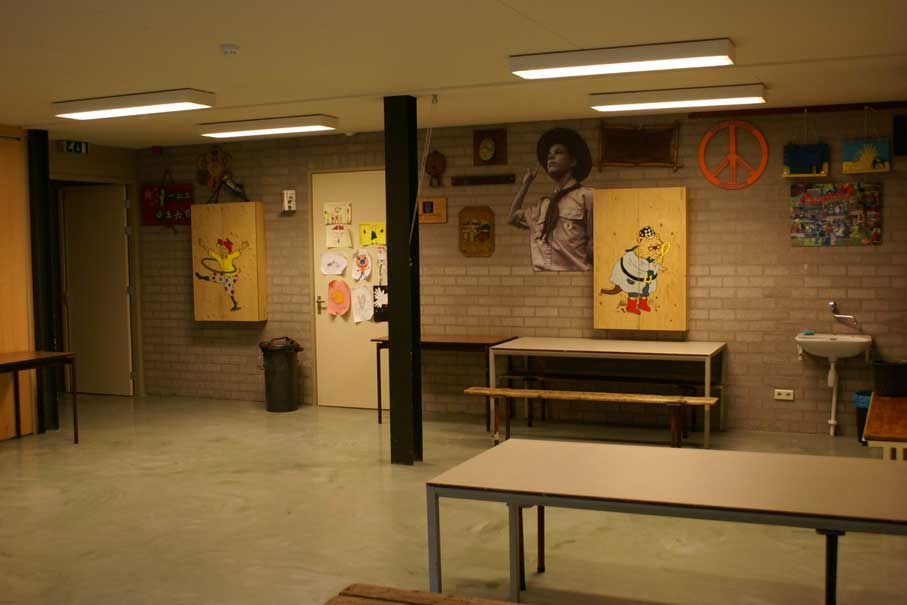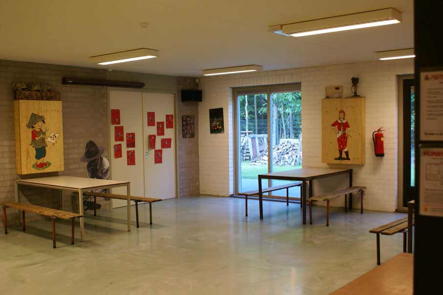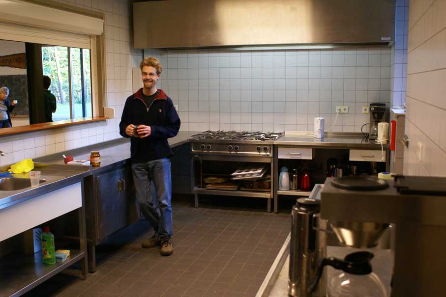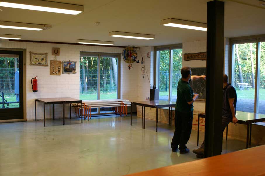 De keuken is ingericht voor het koken voor grote groepen (zie foto 7). Naast het 6 pits gasfornuis, de 2 spoel bakken is er een flinke koelkast. Ook is er door de lange aanrecht bladen veel ruimte om maaltijden te bereiden. Keukengerei zoals pannen en bestek zijn NIET aanwezig voor de verhuur. Na bereiden kunnen de maaltijden eenvoudig "uitgeserveerd" worden door het doorgeefluik naar het rechter lokaal.